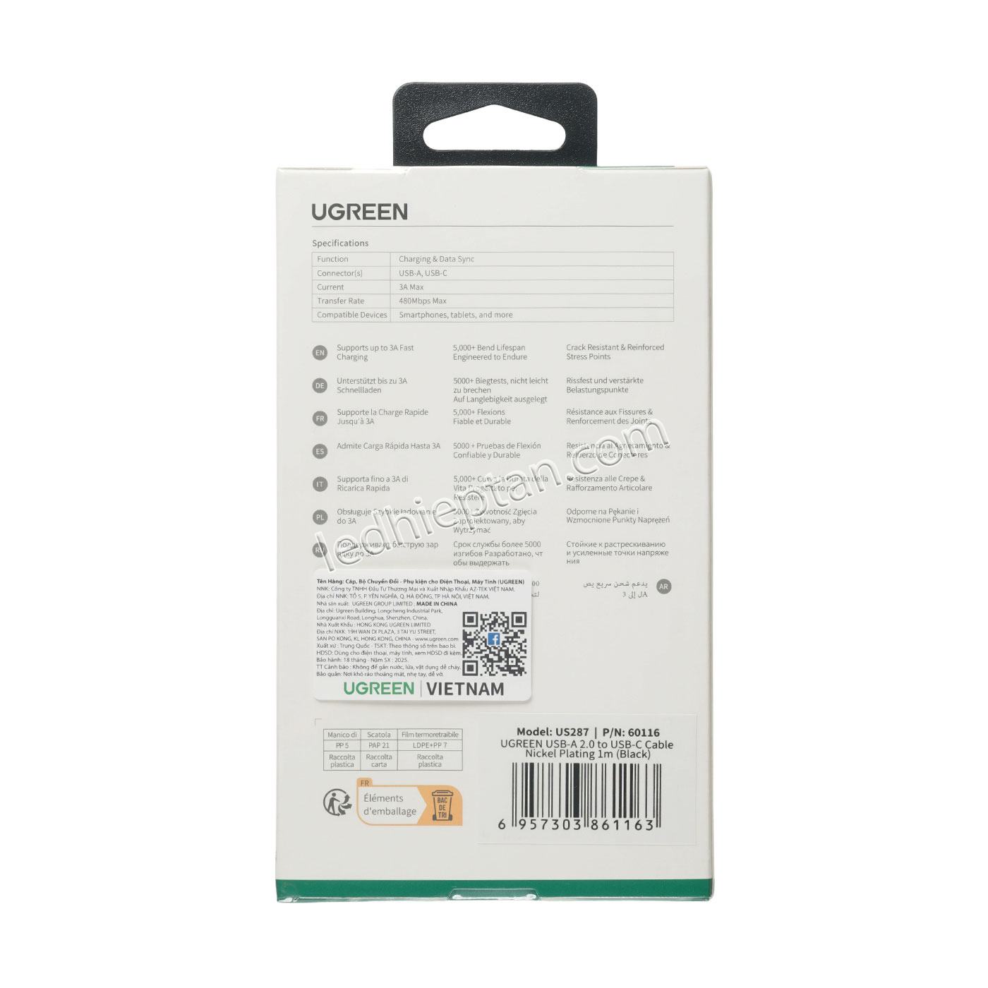 Dây USB 2.0 sang USB Type-C dài1M Ugreen (60116) là một dòng dây cáp tín hiệu chuẩn Type-C. Cho phép sạc đến 3A hoặc truyền dữ liệu giữa các thiết bị với tốc độ tối đa lên đến 480Mgbs